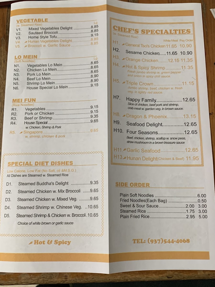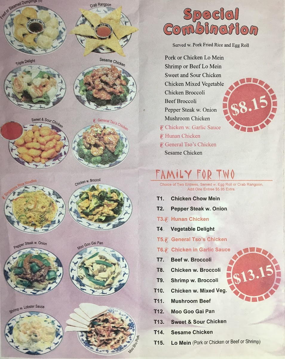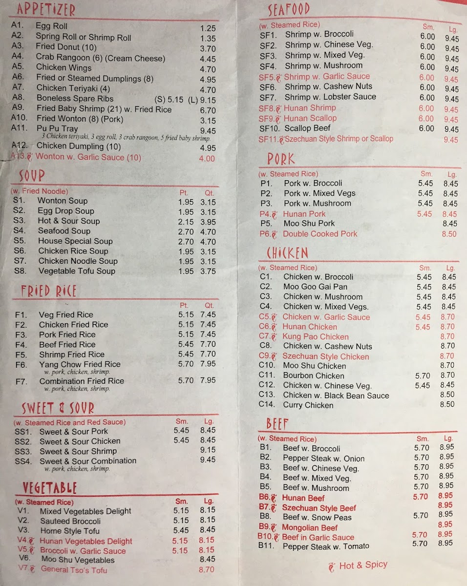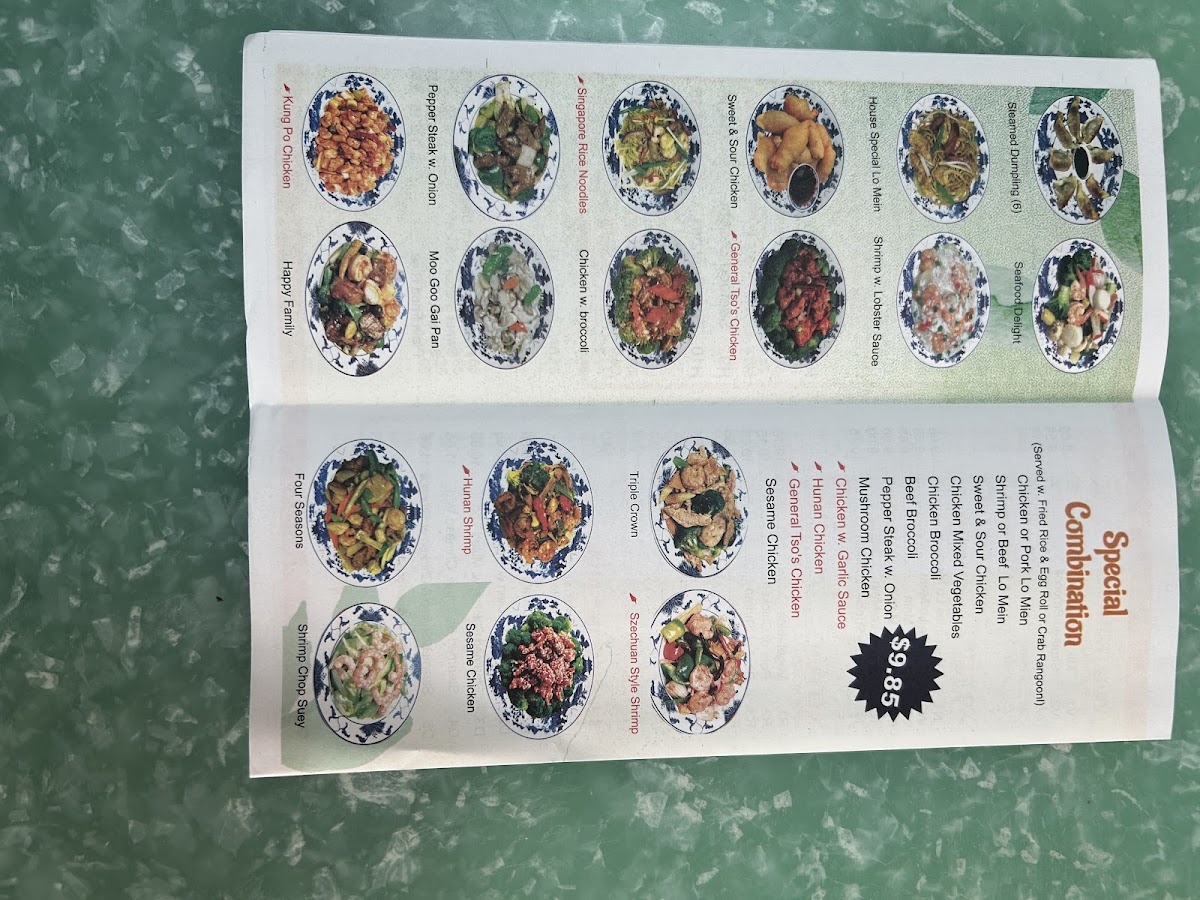 Highlights include dishes like General Tso's Chicken and Chicken Broccoli, which are well-suited for a satisfying lunch or relaxed dinner. Seafood options such as Shrimp with Broccoli or Hunan Shrimp bring a lighter touch, complementing the cozy, no-frills atmosphere. The range of soups and appetizers, from hot and sour soup to fried or steamed dumplings, provide familiar, comforting flavors that pair well with the restaurant’s unpretentious setting.